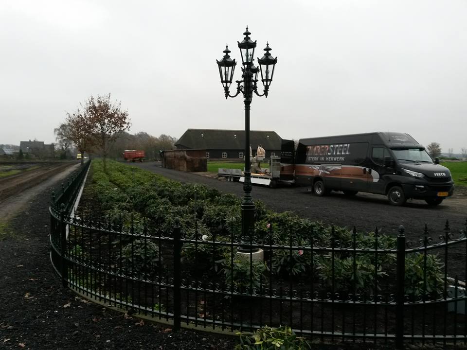 Aanstorten palen met beton. Bij een ondergrond van bijvoorbeeld stelconplaten kunnen de staanders optioneel worden voorzien van een voetplaat en worden verankerd m.b.v. RVS draadeinden.
